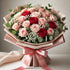 A breathtaking bouquet of 20 exquisite roses in a charming blend of soft pink and rich red hues, elegantly wrapped in luxurious fancy paper with a satin ribbon. Accentuated with delicate baby's breath and lush greenery, this bouquet radiates beauty and sophistication. Perfect for romantic gestures, birthdays, anniversaries, or any special occasion where you want to express love and admiration with timeless elegance.